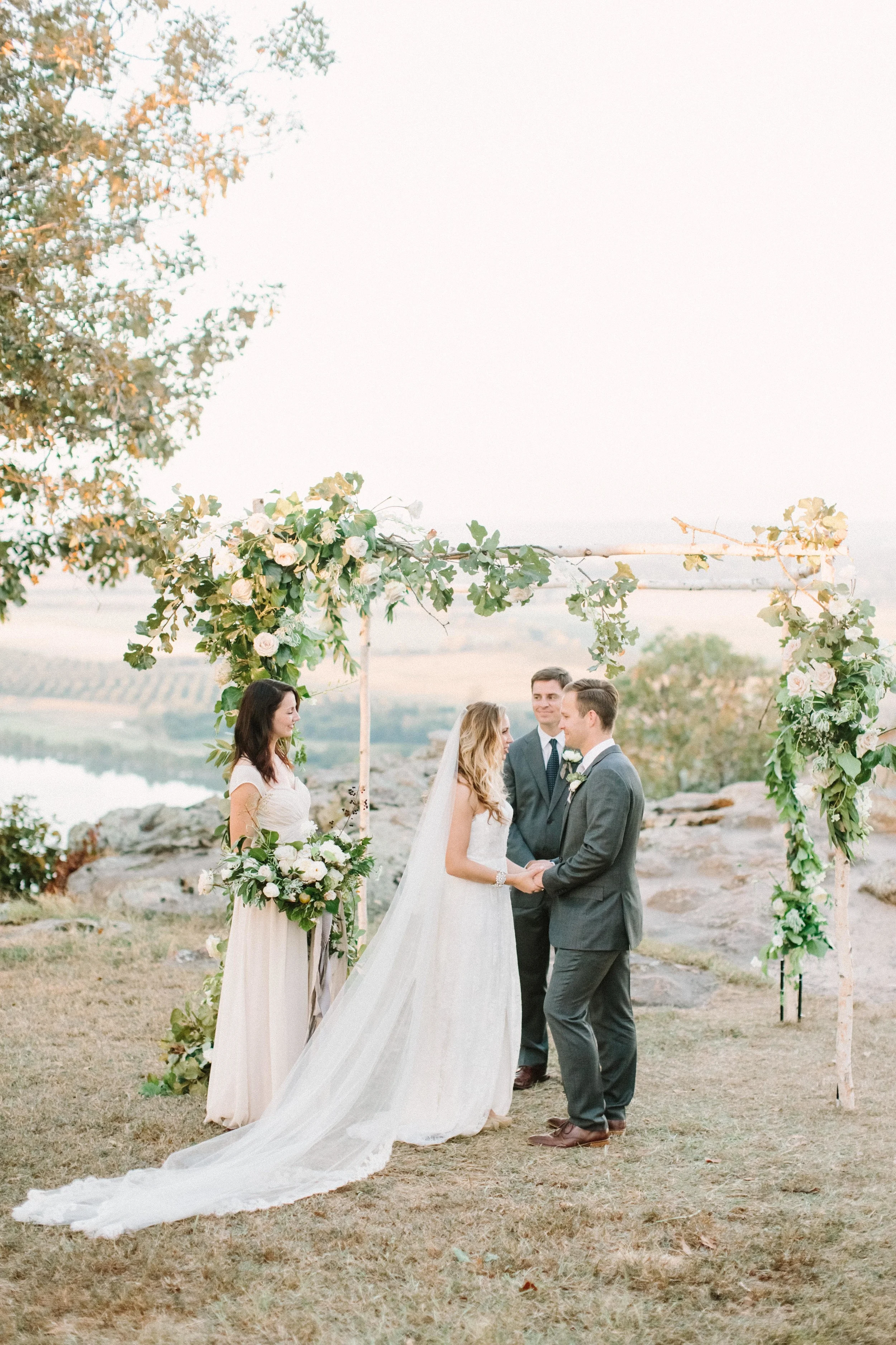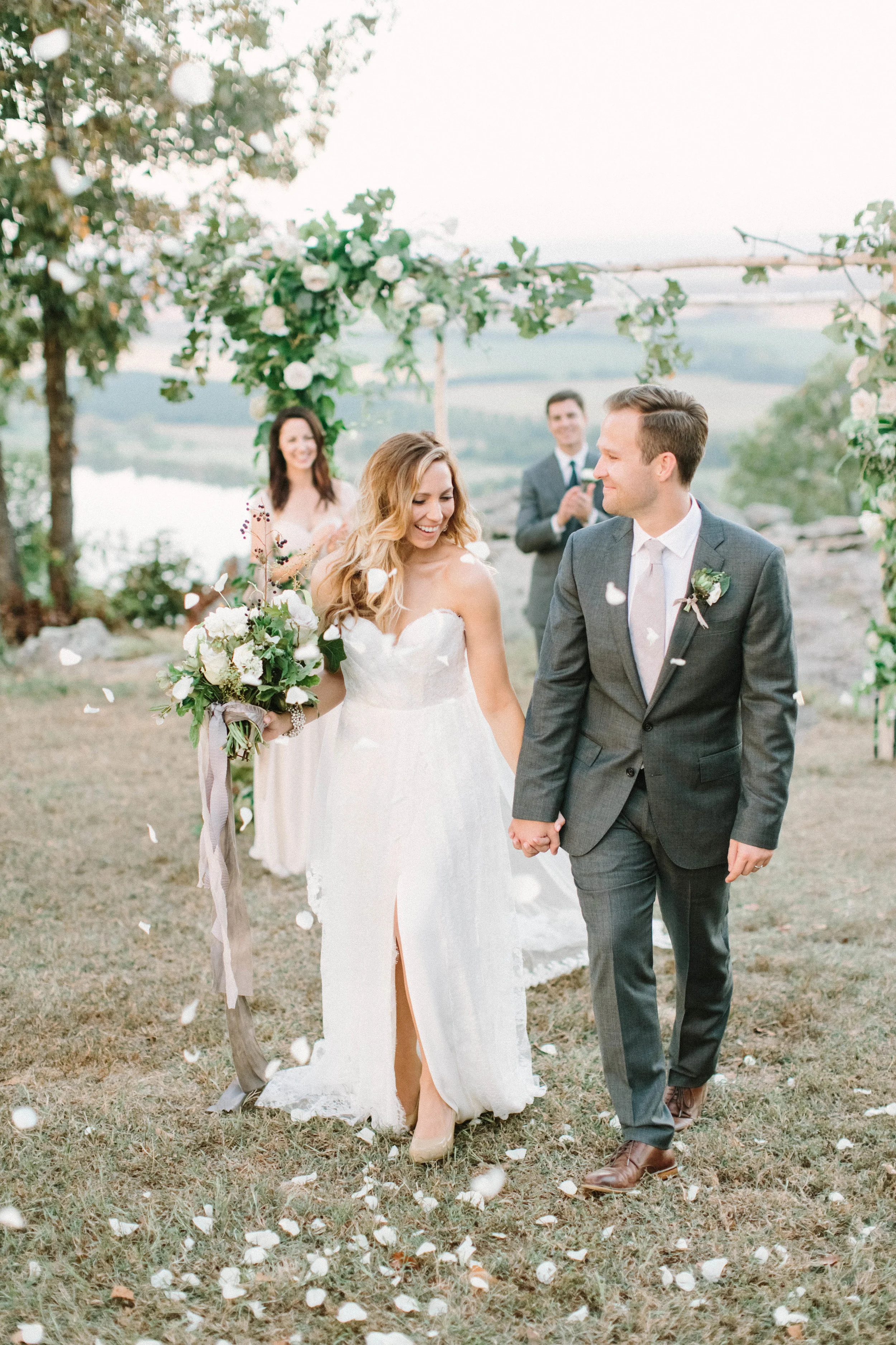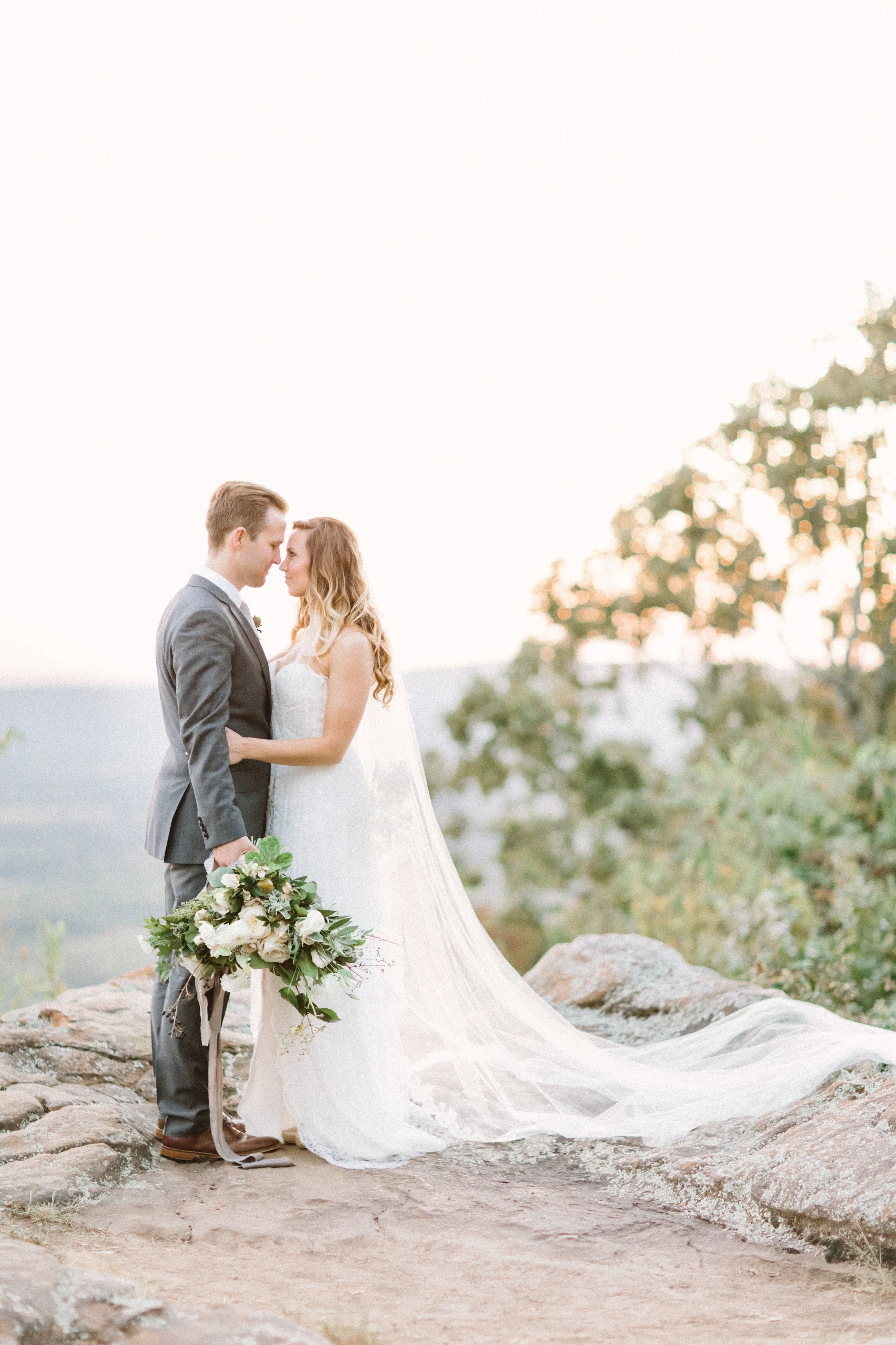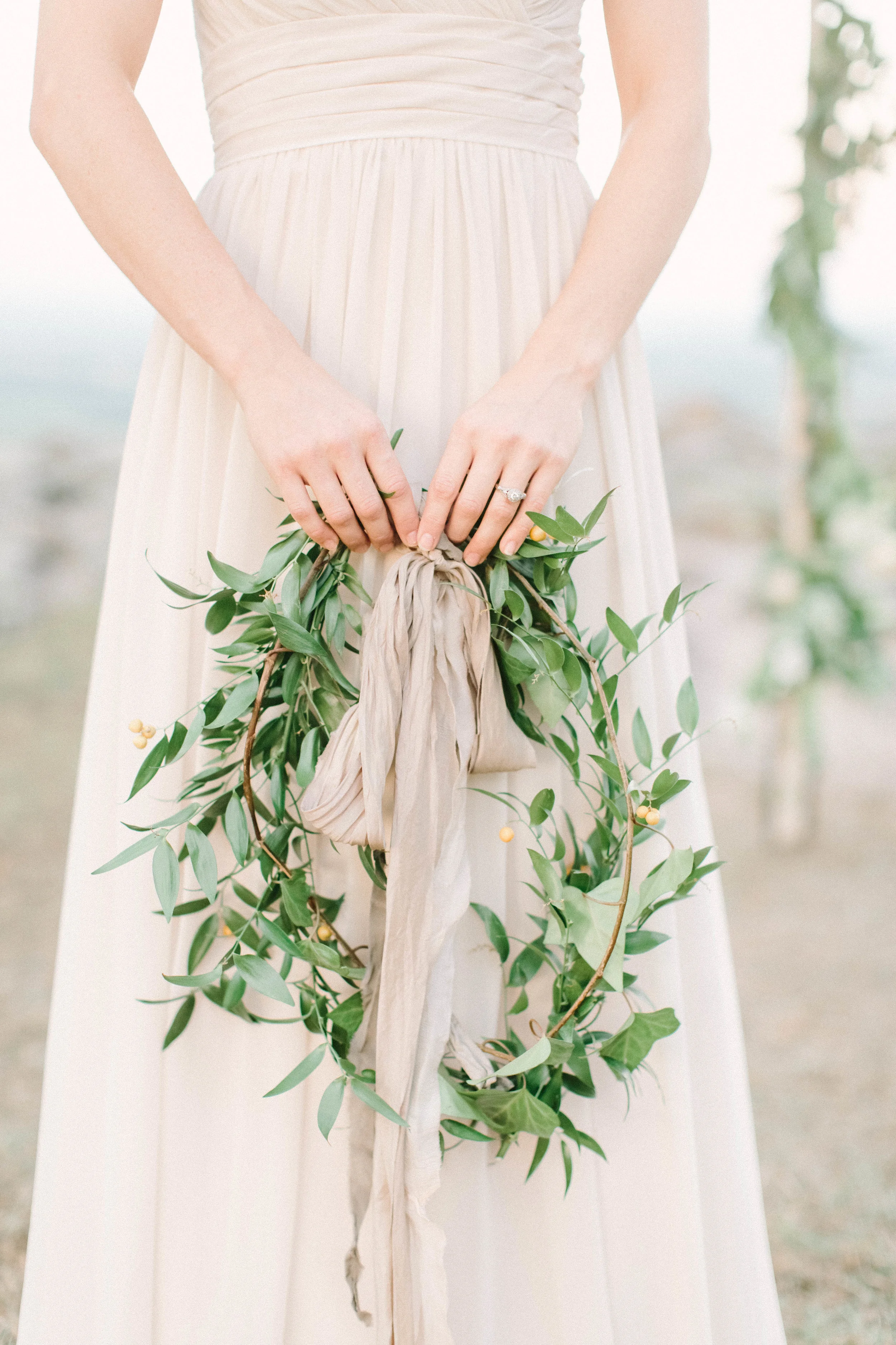 "When I received the inspiration board from Nancy I was thrilled because I love organic floral with a neutral palette. She asked me to do something a little different for the bridesmaid and I just love what we ended up with -- a simple wreath of greenery tied with gorgeous silk ribbon. It’s probably my favorite detail of this entire shoot. I also loved creating this chuppa on top of Petit Jean mountain. Can you imagine a more gorgeous place to be inspired?!”
