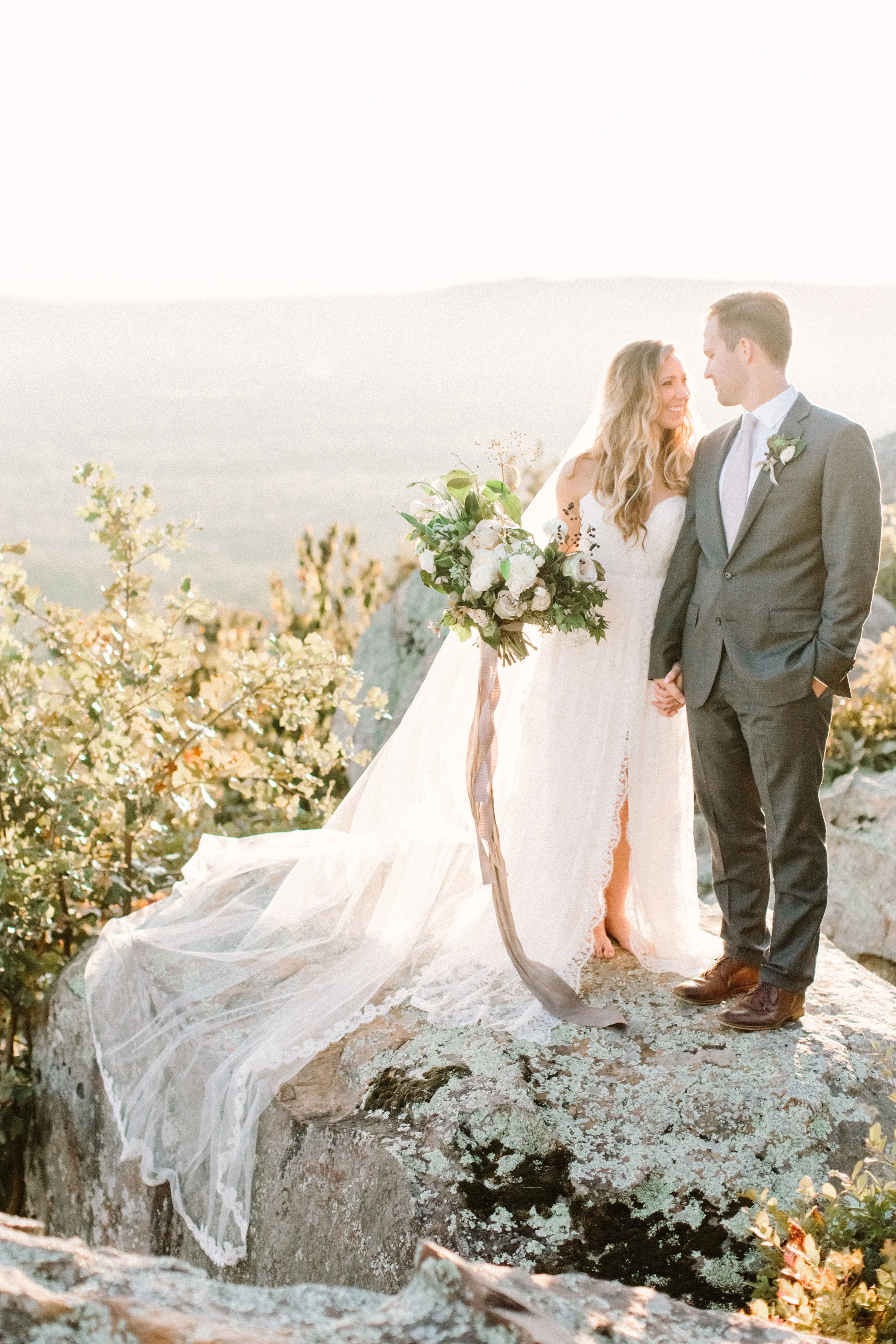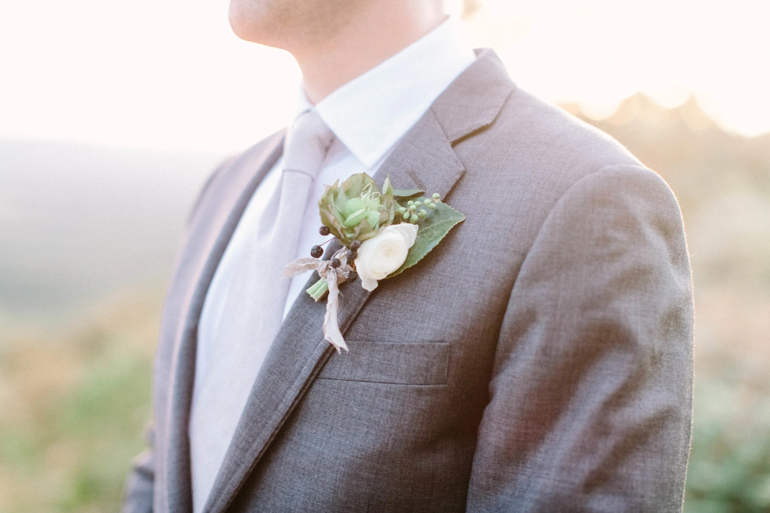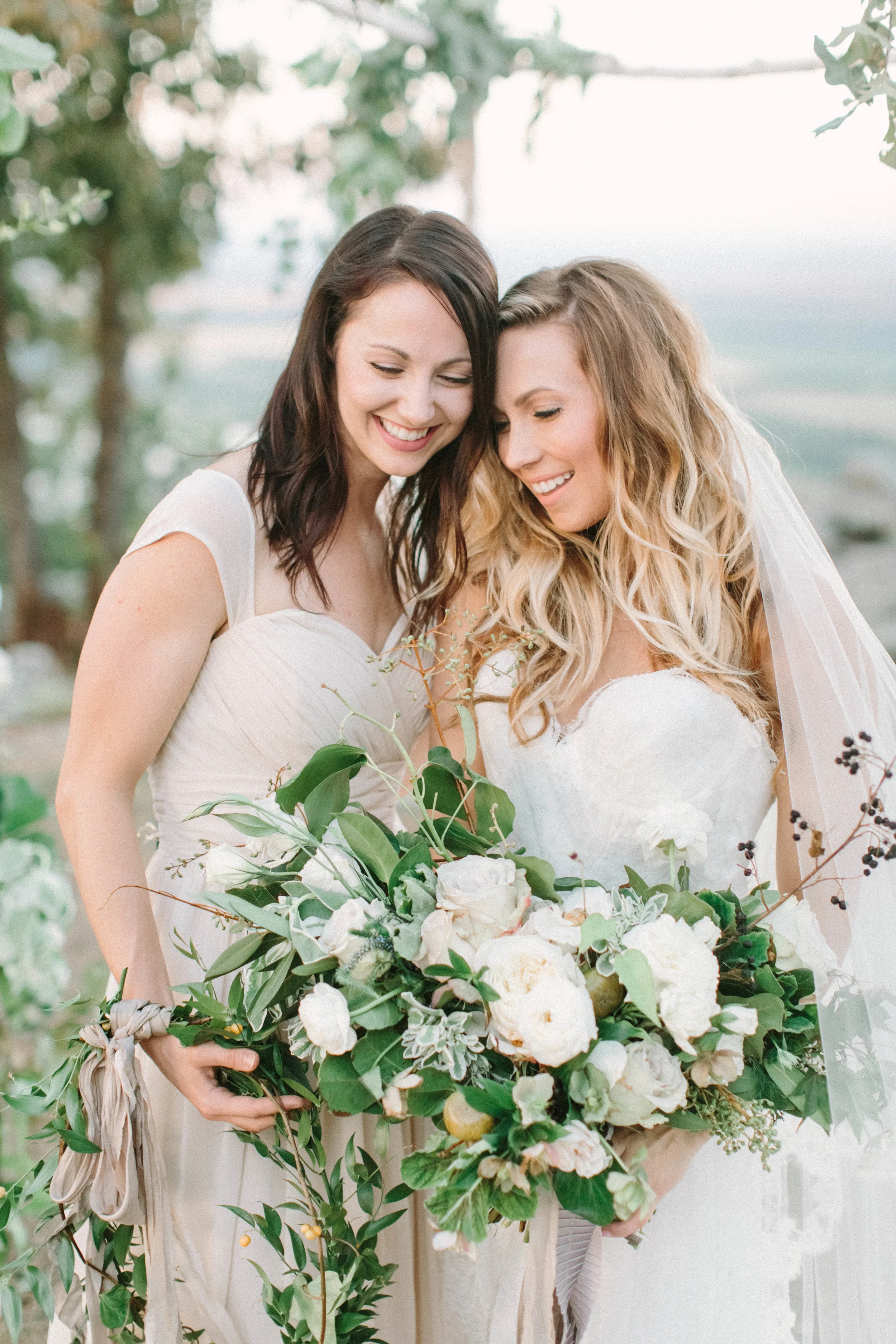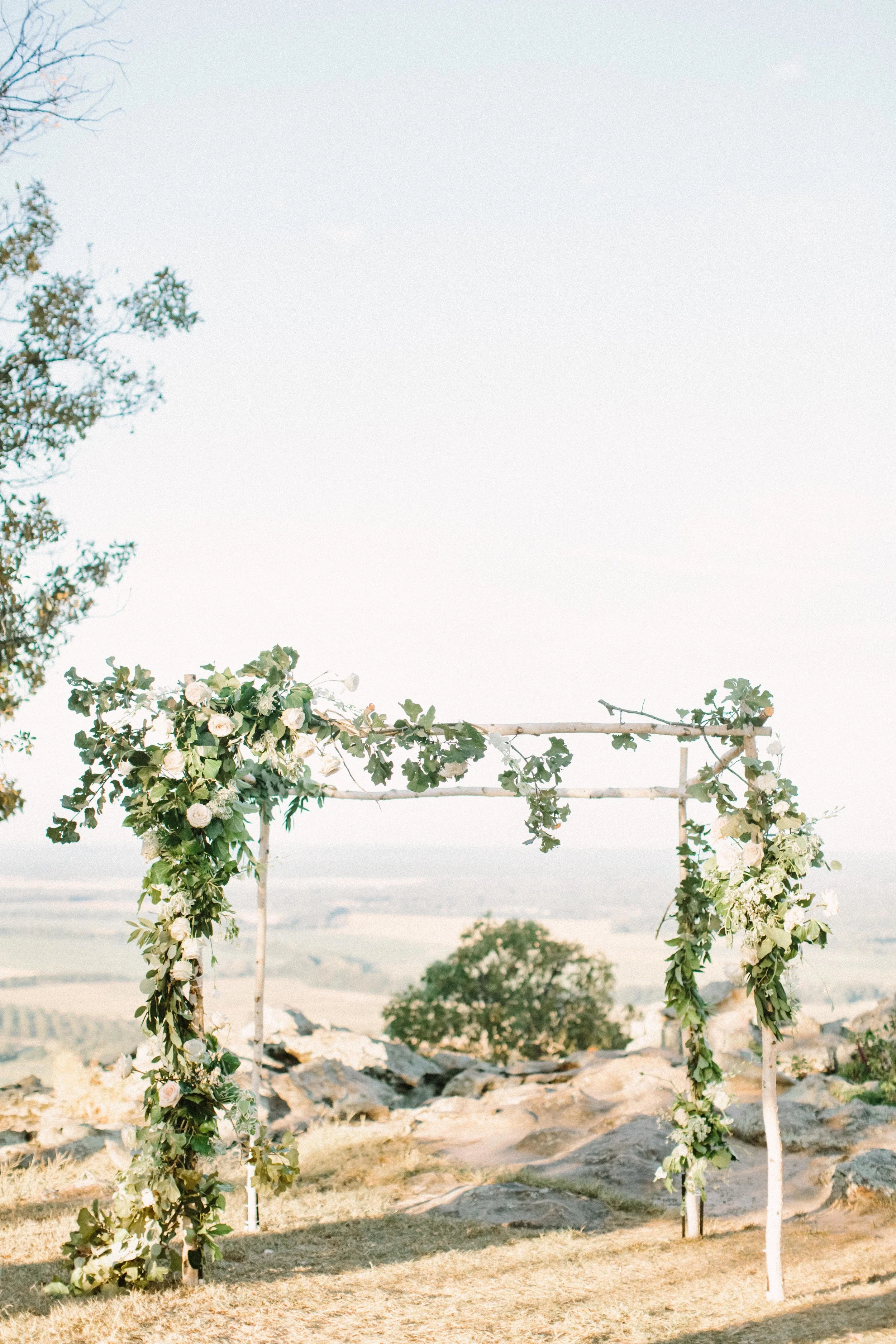 "When I received the inspiration board from Nancy I was thrilled because I love organic floral with a neutral palette. She asked me to do something a little different for the bridesmaid and I just love what we ended up with -- a simple wreath of greenery tied with gorgeous silk ribbon. It’s probably my favorite detail of this entire shoot. I also loved creating this chuppa on top of Petit Jean mountain. Can you imagine a more gorgeous place to be inspired?!”