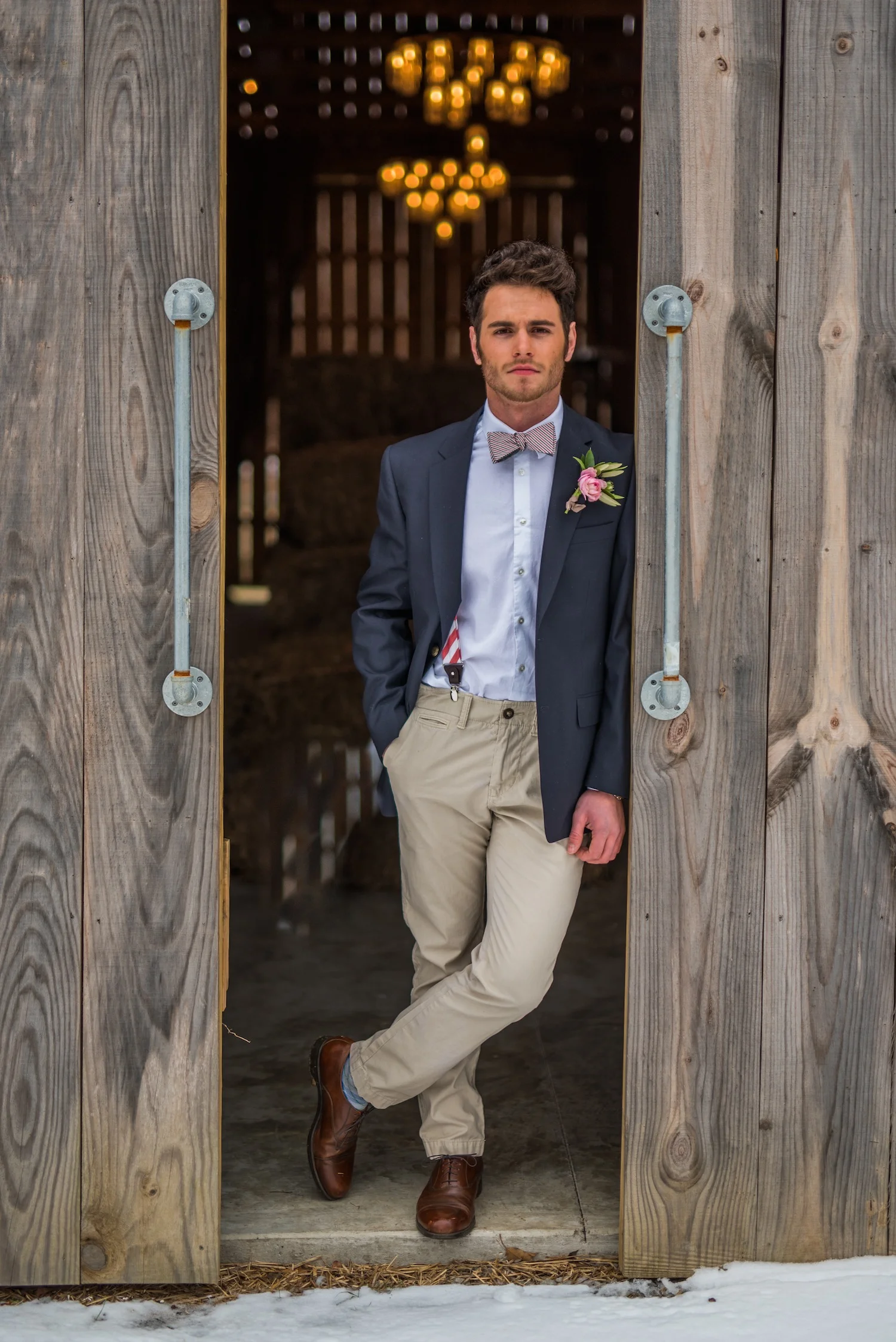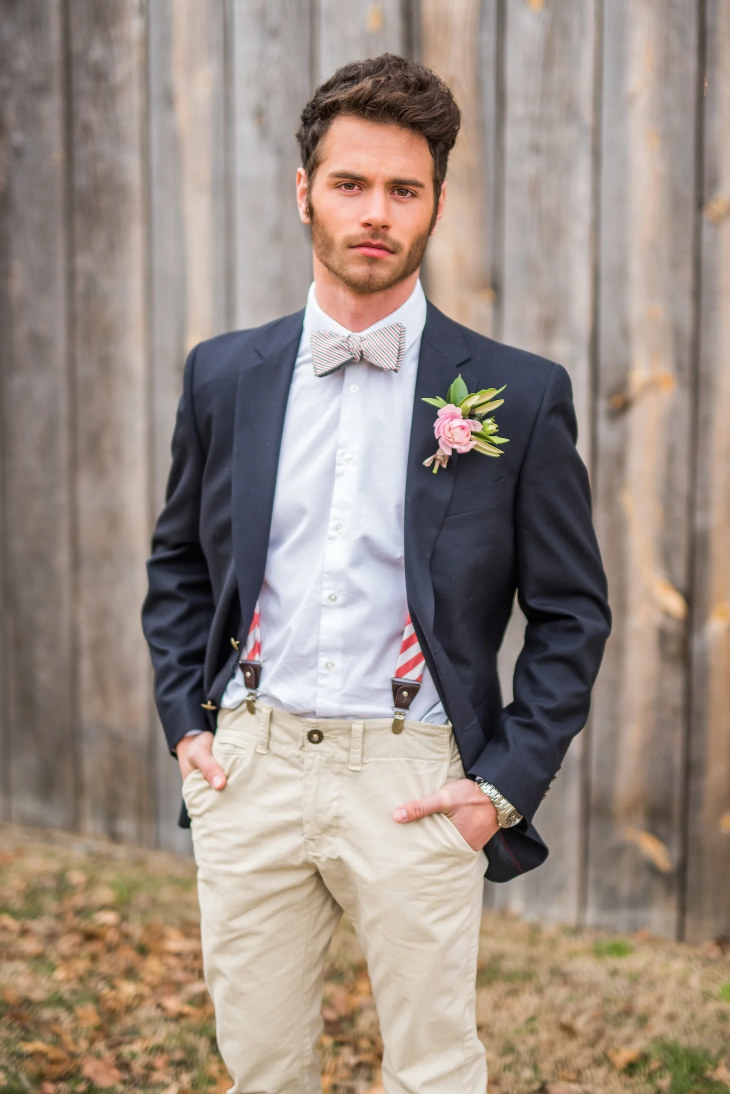 My inspiration came from just that – dressing up when you're dressing down. A basic pair of khaki chinos and a plain white Calvin Klein button-up gave a classic yet casual feel. We added suspenders to give a little uniqueness and color to the look, then dressed it all up with a sports coat. we avoided going too modern by keeping more of a transitional style that gave off a casual, relaxed elegance.